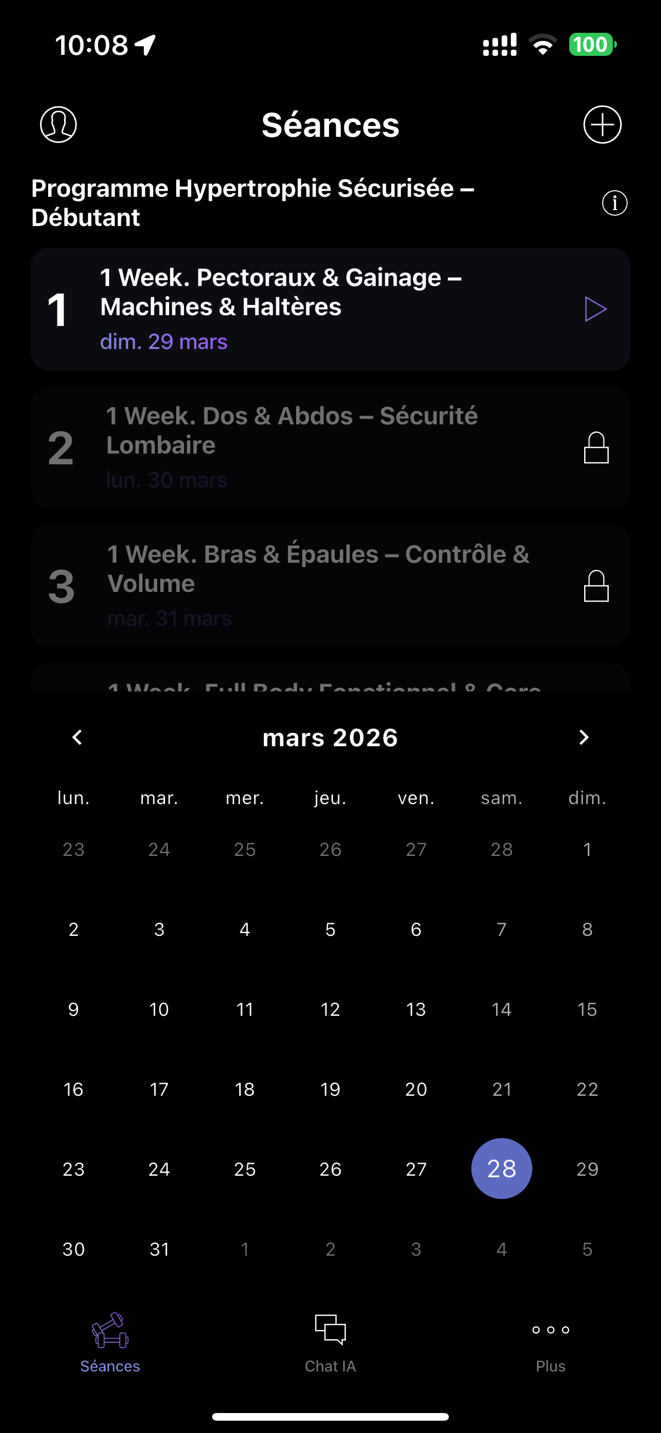 Suivez le plan, enregistrez vos séries. Pas sûr de la technique ? Demandez au coach IA. Besoin d'un remplacement ? L'IA en trouve un.